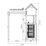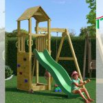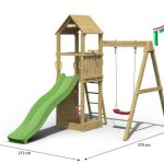 A combined wooden device with one tower and a swing, from green treated pine wood .