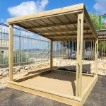 סככה מרובעת בגודל 3*3 עם גג איסכורית וארגז חול מעץ.