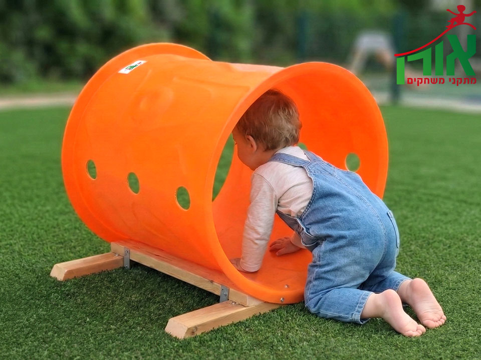 מנהרת זחילה דגם סנונית עשויה פלסטיק בצבע כתום עליז, העומדת על בסיס עץ חזק ויציב.